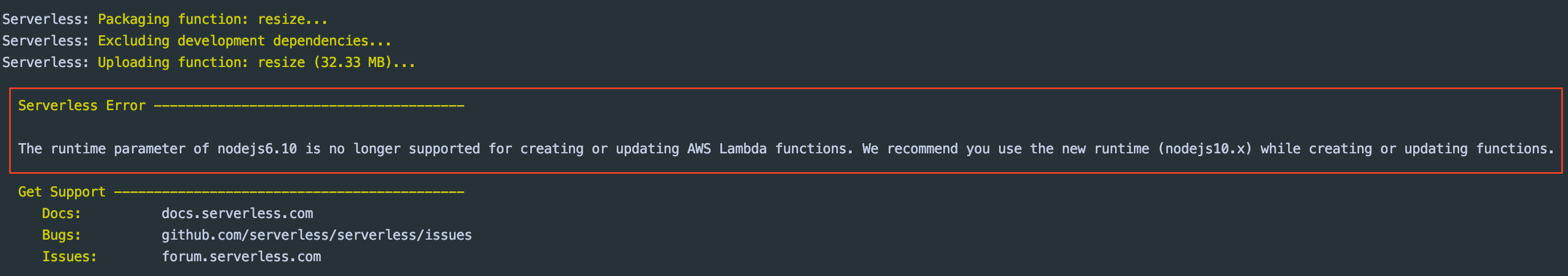 Serverless Error: runtime parameter of nodejs6.10 is no longer supported