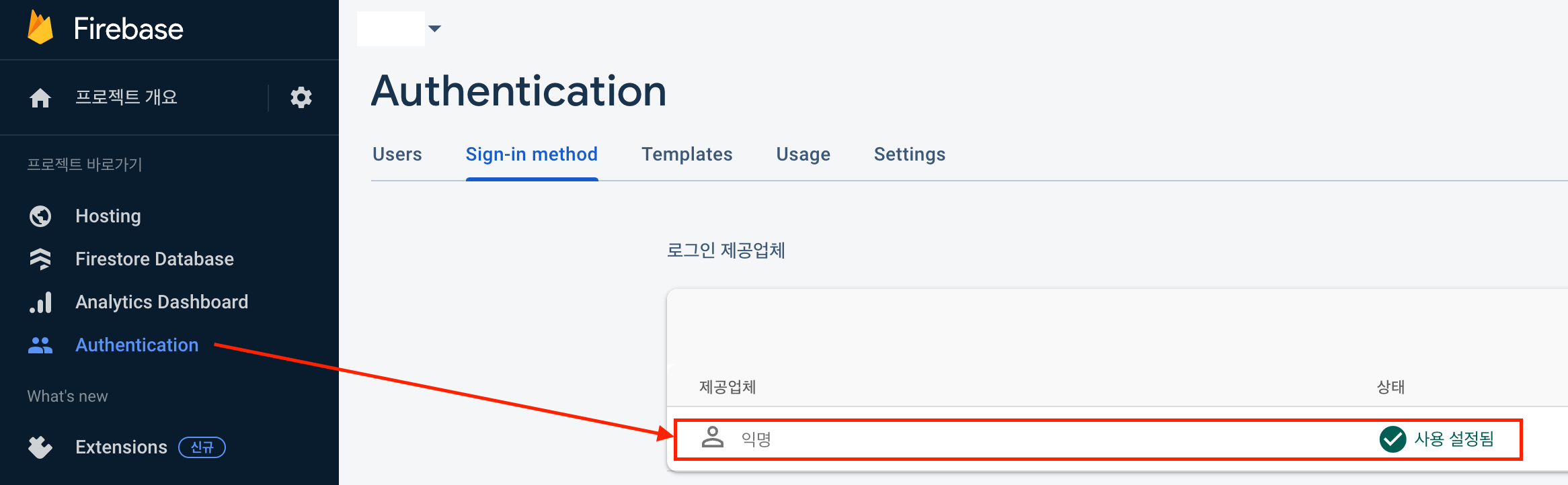 Firebase 콘솔의 Authentication 페이지에서