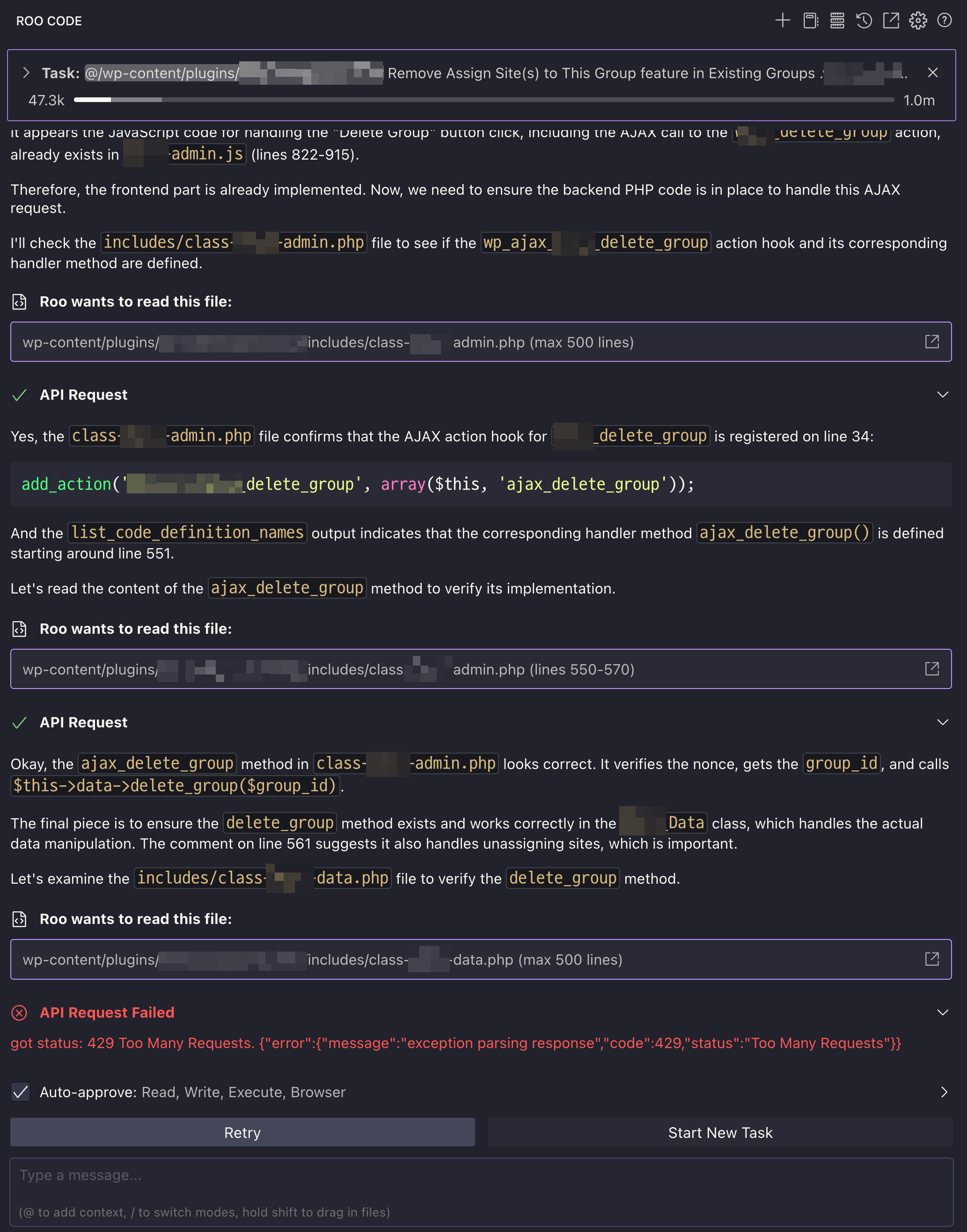 두번째 프롬프트 명령 내린 후 수행이 좀 되다가 아래 스샷과 같이 429 상태 오류 응답 발생함.